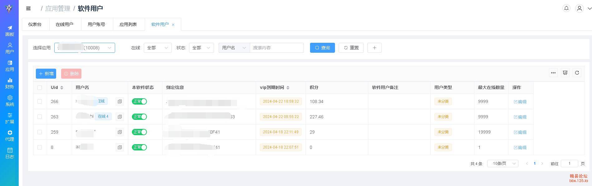| 软件用户 | 软件用户的增删改查,用户注册图表统计,用户绑定信息时间积分编辑,单独用户备注(可以用来给用户单独定制功能) |