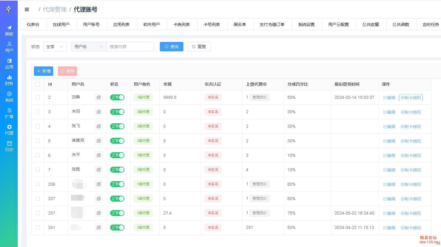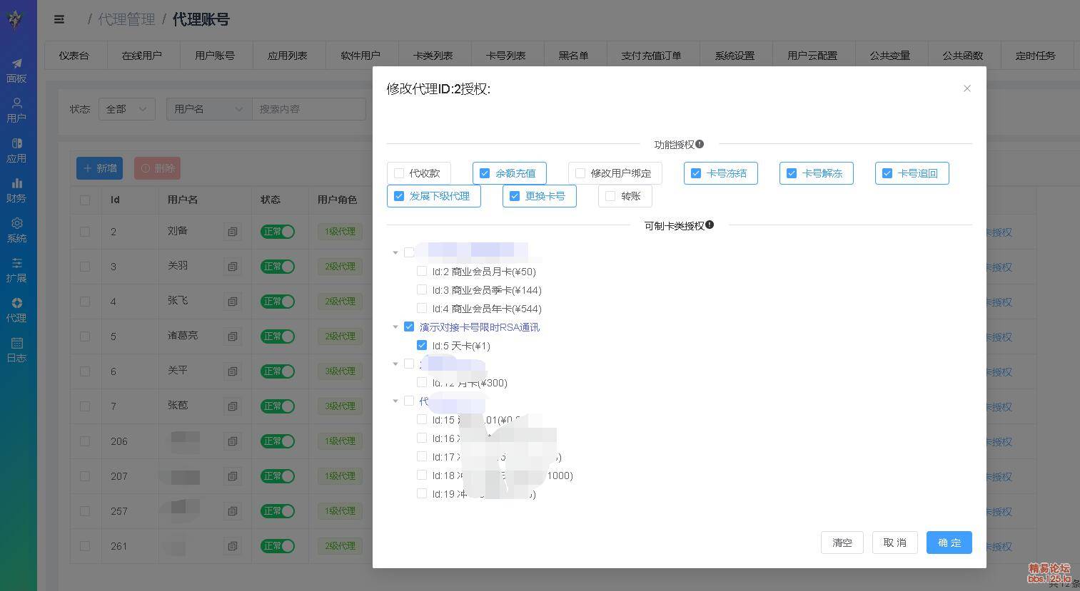| 代_理账号 | 一级代_理账号增删改查,代_理架构图表,功能授权(卡号冻结``解冻``追回,余额充值,转账,发展下级,修改用户绑定,更换卡号,代收款(这个特别实用,详情查代_理说明)) 可制卡授权(可以根据应用分类授权卡类ID) |