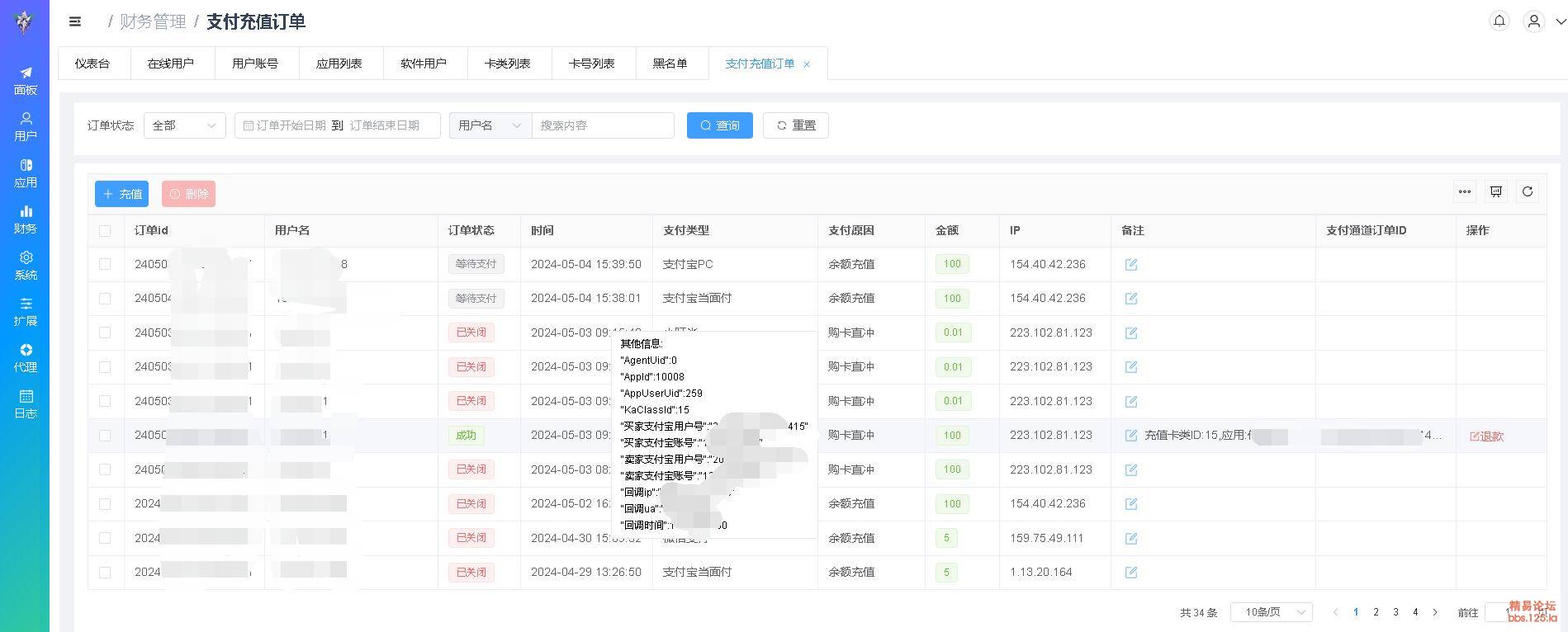 | 支付充值订单 | 所有支付订单都在这里统计包含代_理代收款订单,如自助购卡, 购卡直冲(就是续费),充值余额积分,订单备注等等 ,支持支付宝微信的操作全退货部分退款(也可以在配置文件中关闭这个功能,为了安全),还可以手动给指定用户充值余额) |