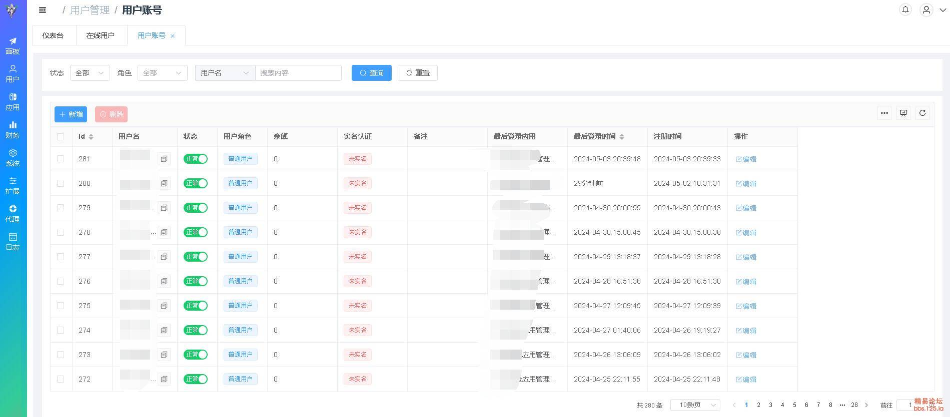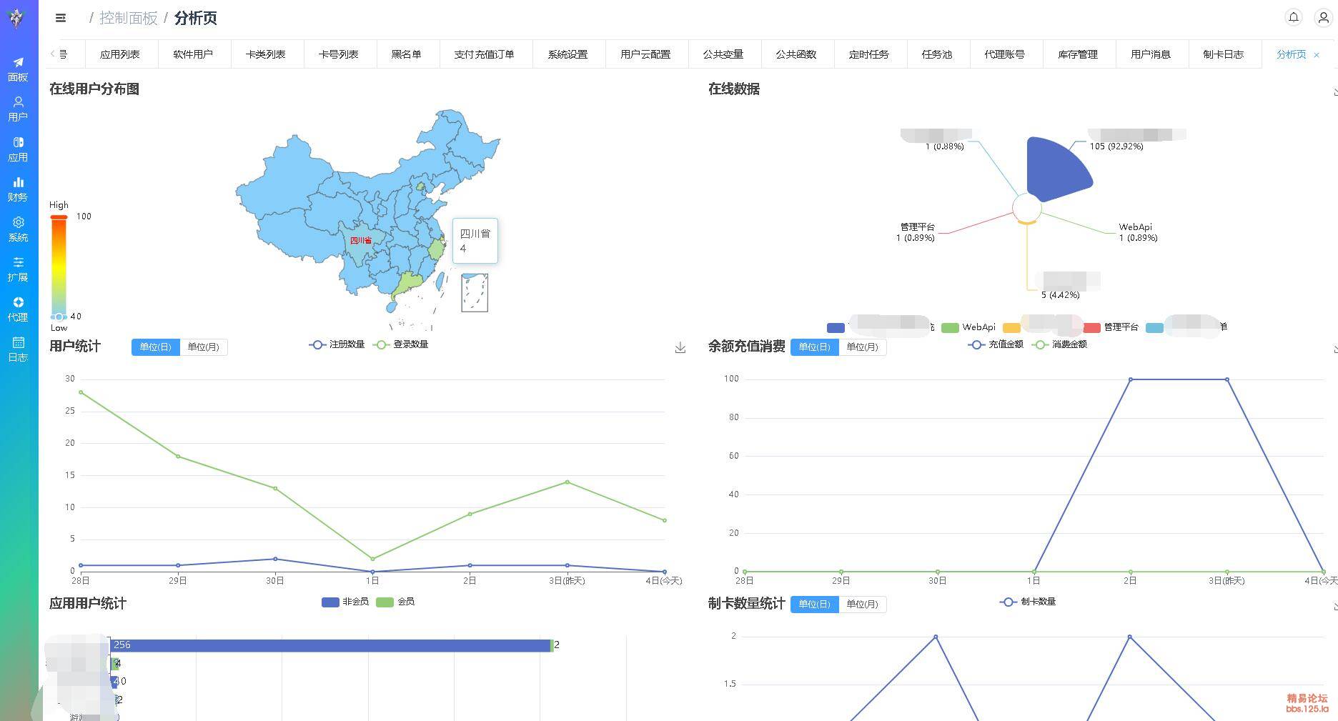 | 余额日志 | 用户余额扣费,管理员手动编辑余额日志,只要余额变化,就会有日志,充值消费图表分析, 百万+记录,数据秒返回,之前php验证就是这里数据多了直接卡死不返回,每次都得自己到后台数据库处理,其他日志也做了优化 |