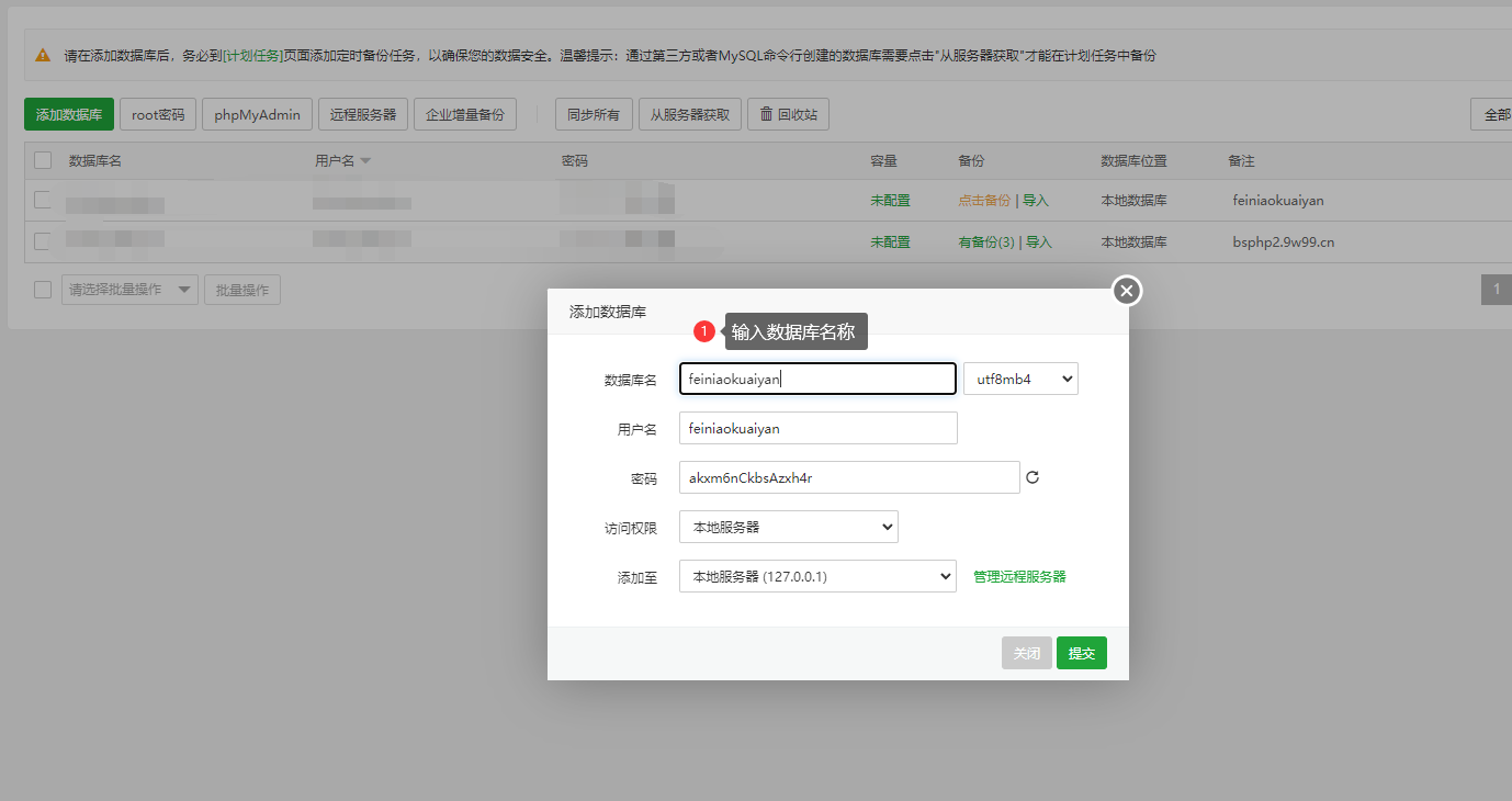 宝塔,数据库=>MySql=>添加数据库,添加新Mysql数据库