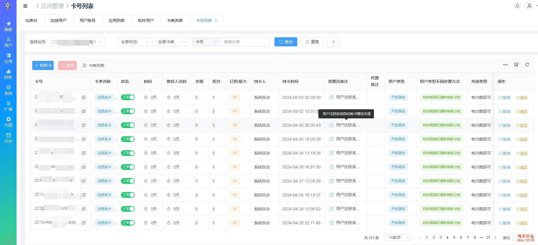 | 制卡日志 | 卡号的增删改查,都会在这里显示,包括用户直接购卡, 会显示订单ID,方便查漏补缺 |
