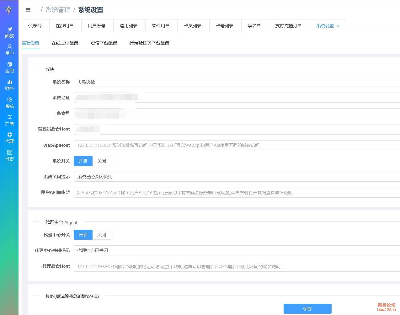 | 系统设置 | 管理后台WebApi host设置,可以让管理和WEBapi使用不同域名,更安全,用户API加密盐(给用户api接口进行+盐取摘要,有效防止山寨服务器),代_理开关等 |