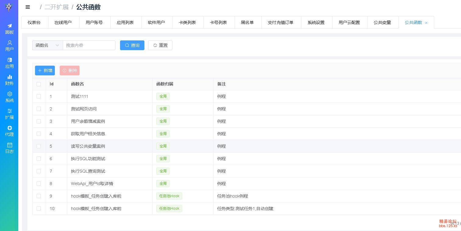 | 公共函数 | 就是js函数,内置了一些操作用户等信息的中文公共函数api(函数名为中文,可读性强我还是很喜欢中文的),还可以hook用户api,方便二开扩展 |