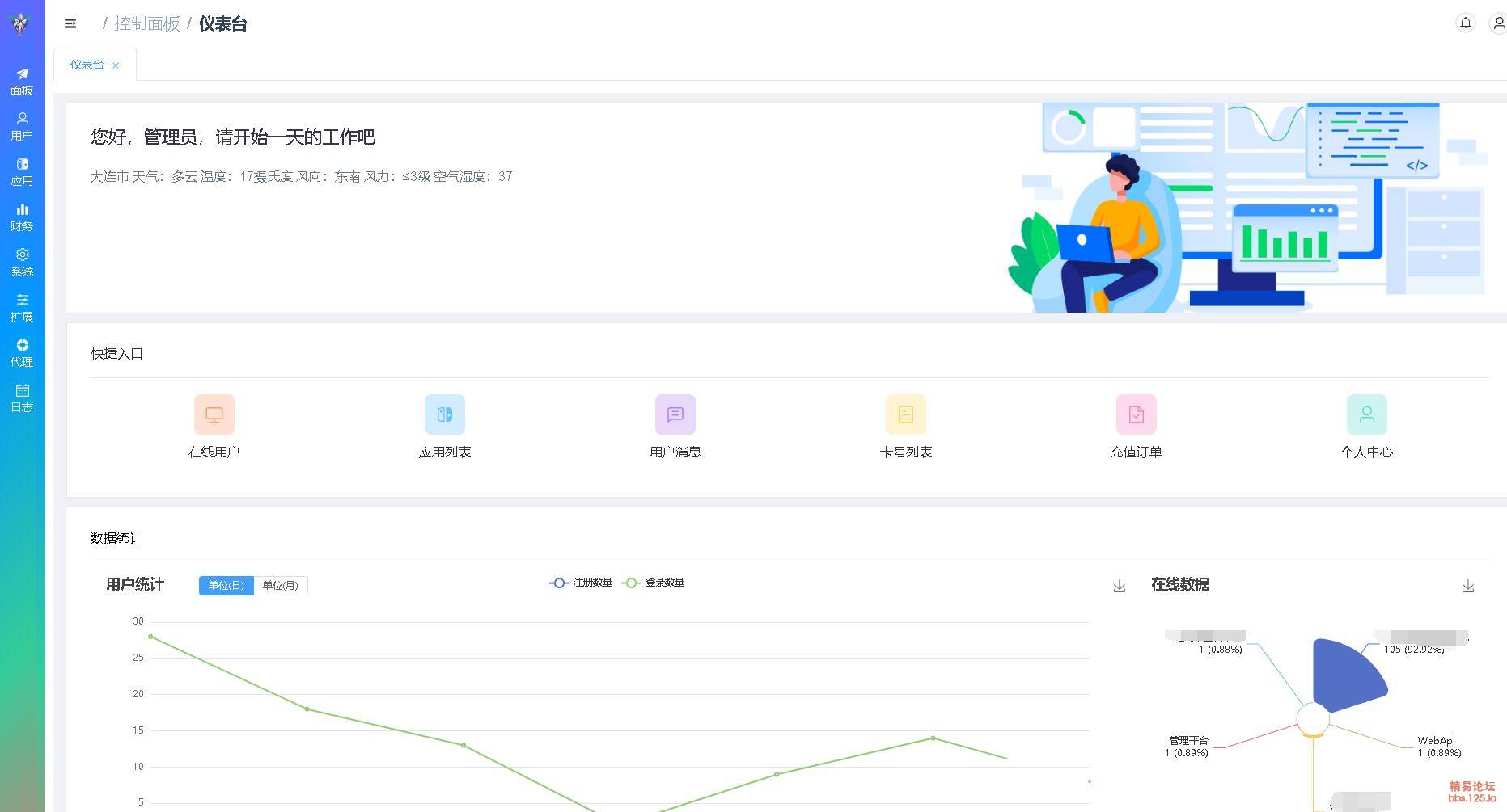 | 在线管理 | 在线用户查看 登录注册用户分类图表统计,踢出,新建WEBApi令牌等等 |