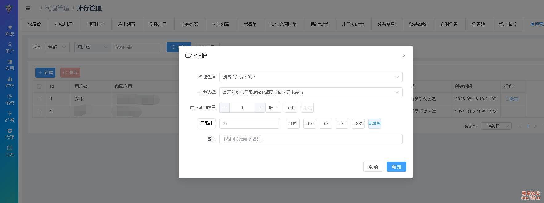 | 库存管理 | 除了下级购卡上级分成方式,还可以直接上级给下级制卡库存包,支持限制时间,上级还可以撤回下级的库存,库存创建人,可以重置有效时间,这样下级完全由上级控制,不用在系统内充值余额,多种发展选择 |