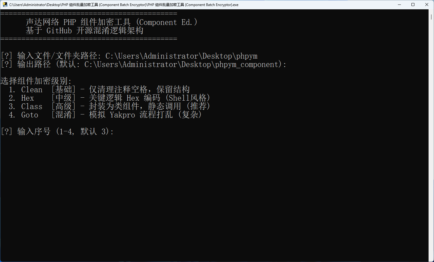 # 加密单个文件 python component_encryptor.py MyClass.php -o MyClass_protected.php -m 3 # 加密整个插件目录 python component_encryptor.py ./my-plugin -o ./my-plugin-encrypted -m 3 # 保留原注释 python component_encryptor.py input.php -o output.php -m 3 --keep-comments 交互式操作 $ python component_encryptor.py