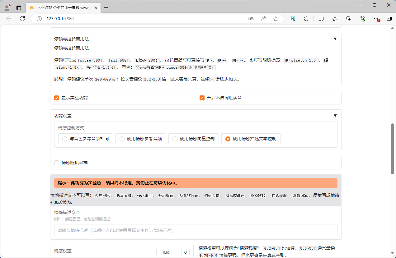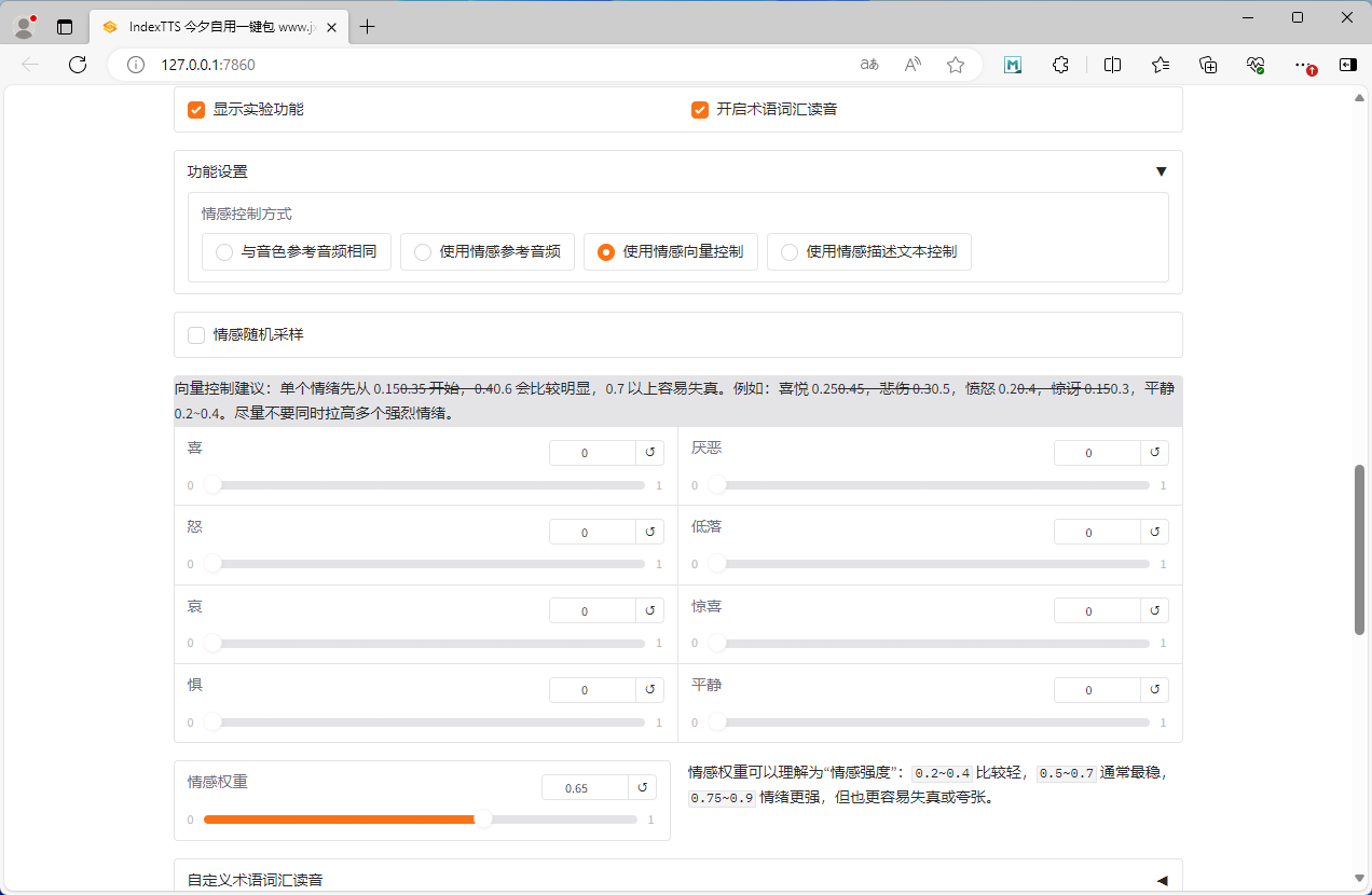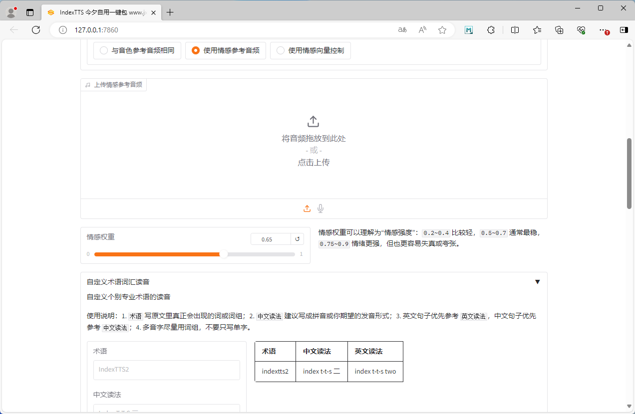 4.支持手动设置情感值,使用情感参考音频,自定义术语库等