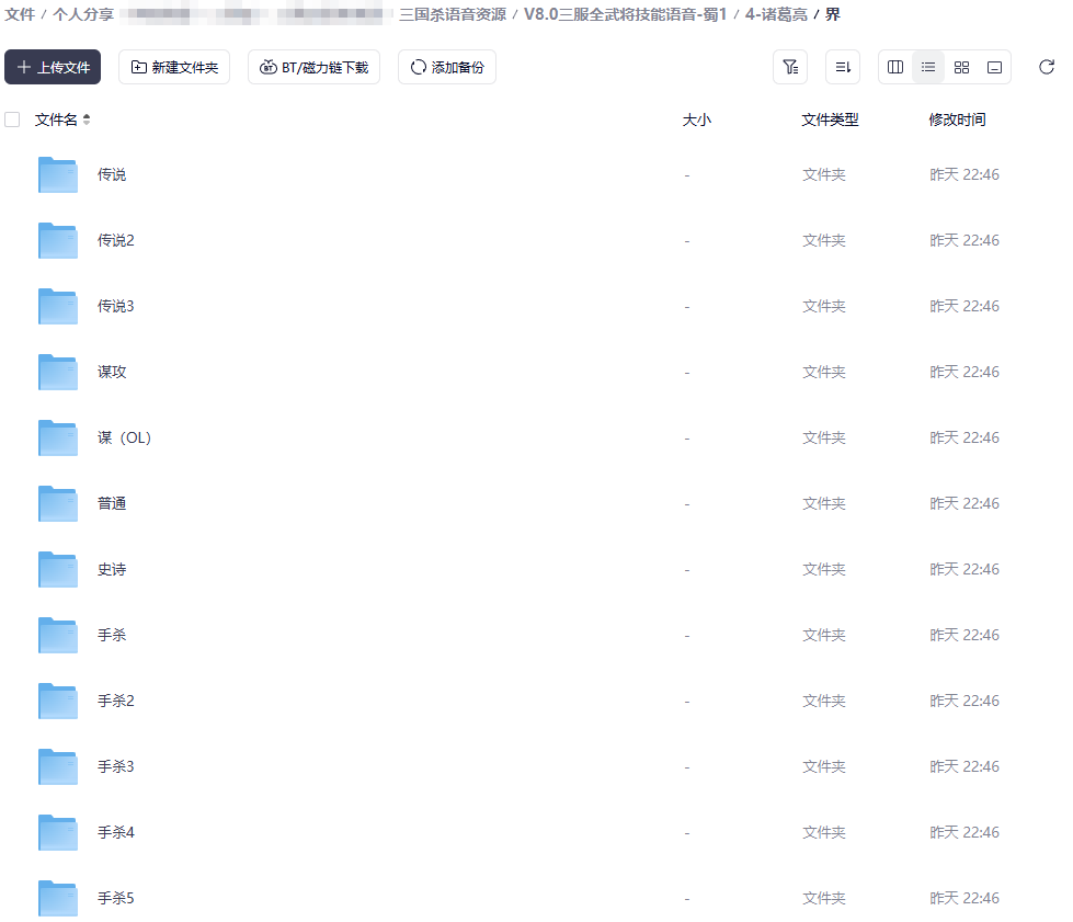 根目录下包含了 11 个V8.0三服全武将技能语音分卷文件夹,以及活动语音、资源来源说明文件夹,