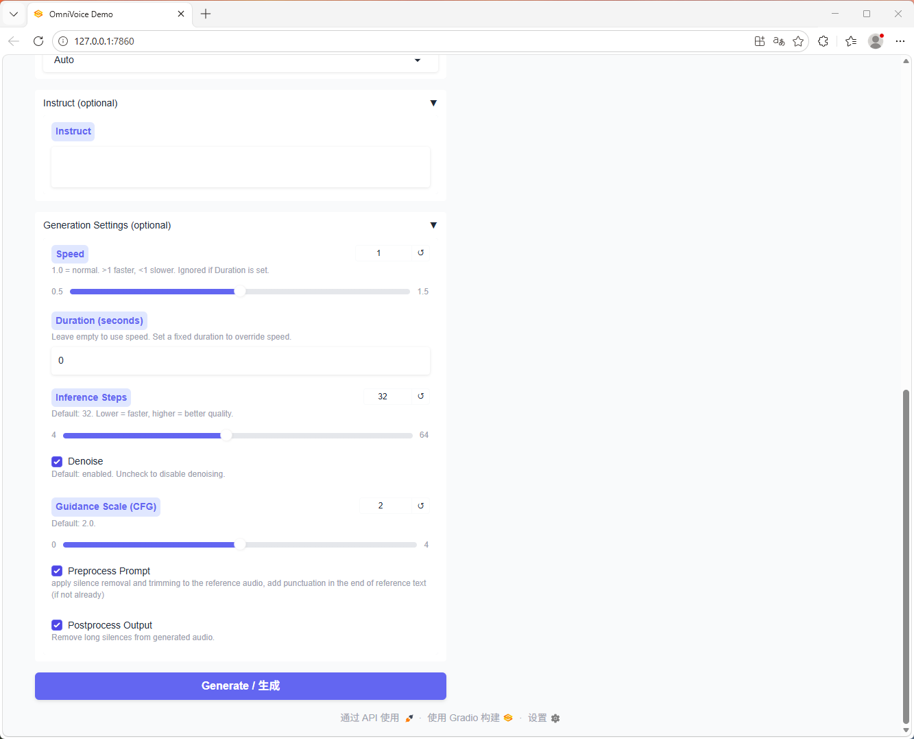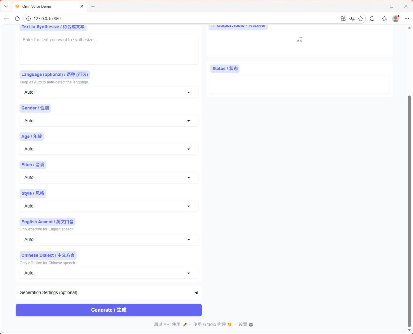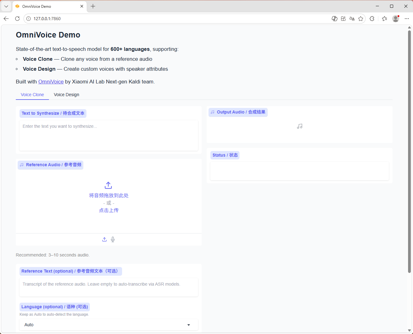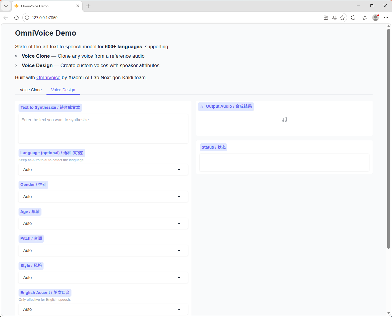- `omnivoice-demo`: 原版 Gradio 演示页