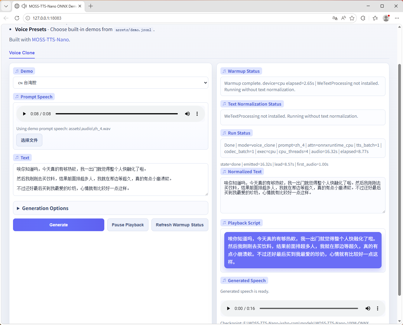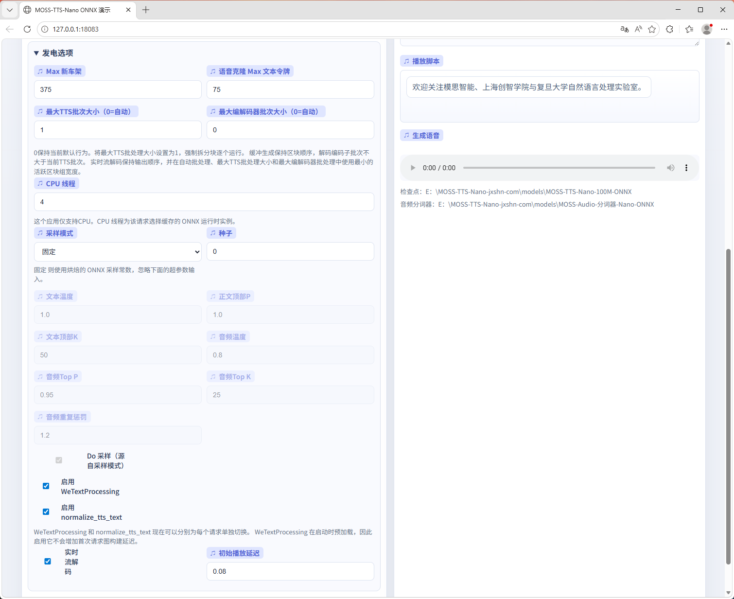 MOSS-TTS-Nano ONNX一键包708M 仅0.1B参数 轻量化部署无压力 无需显卡 在CPU上运行 支持 CLI、网页演示、Python API、浏览器扩展 支持中文、英文、日语、韩语等近 20 种语言