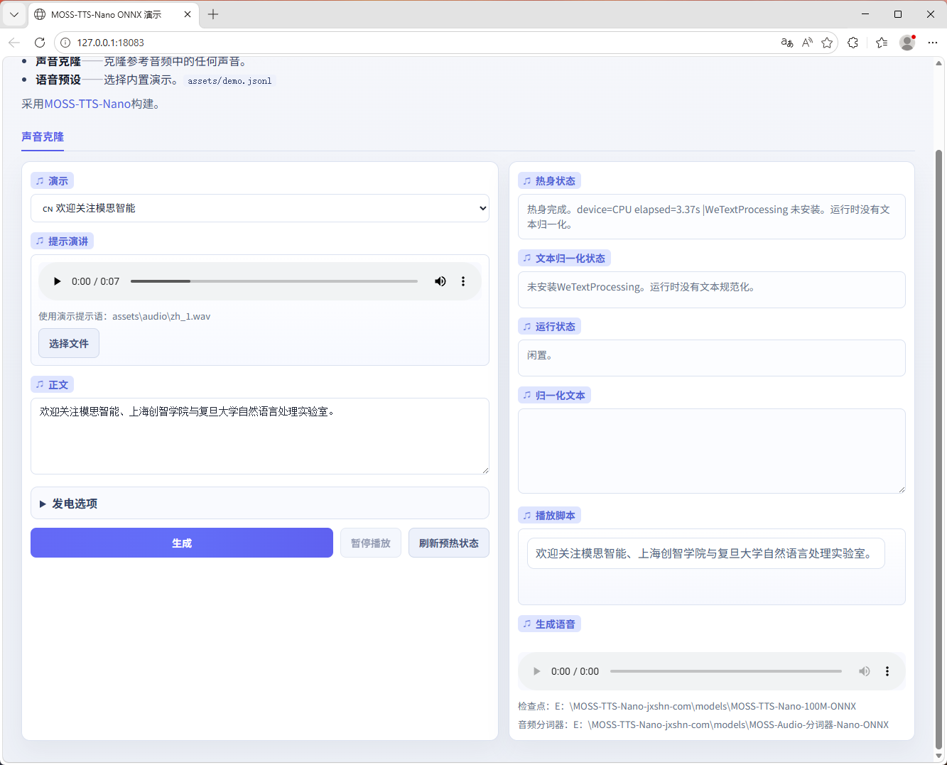 moss-tts-nano generate \ --backend onnx \ --prompt-speech assets/audio/zh_1.wav \ --text "欢迎关注模思智能、上海创智学院与复旦大学自然语言处理实验室。"